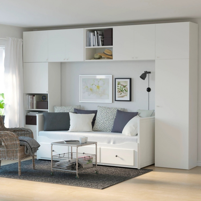 Идите сразу на Pinterest и поизучайте варианты расстановок и хранения, только в поиске запросы на англ вводите. Плясать надо не от мебели, а от расположения окон и дверей в комнате в первую очередь, тк комната маленькая. Там же надо ещё и свободное место оставить, не просто все мебелью укомплектовать. Дайте план комнаты, тогда проще будет вам посоветовать варианты.