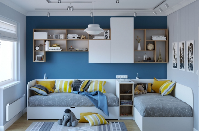 Нас ожидает подобное обустройство, но только для двух мальчиков. Если позволяет место выбирайте отдельные кровати и лучше не двухъярусную. Я бы даже полки/шкафы над постелью не вешала.
