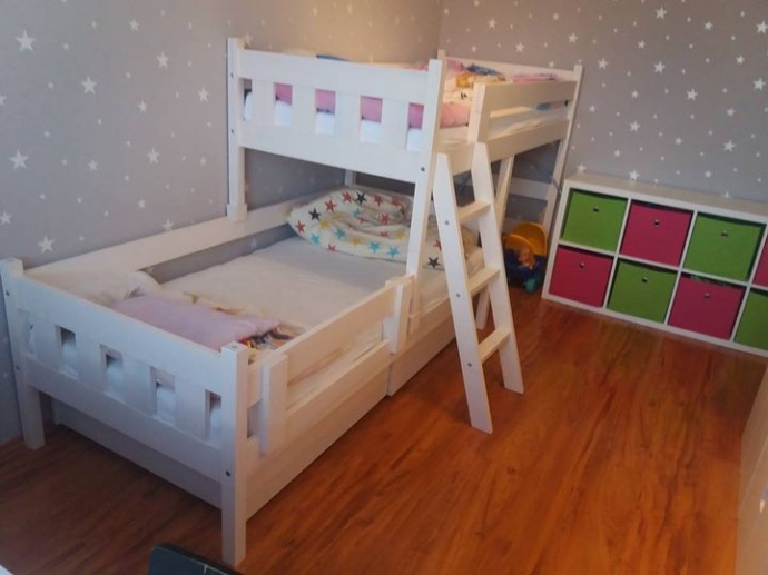 http://www.postele-palandy.cz/ Проверенное truhlarstvi, делают постели из массива, можно натуральный цвет или белый. Для двоих детей posuvne palandy, rohove palandy. И ящики хорошие под постель, под верхней кроватью остается место для комода или уголка с игрушками. Старший спит наверху — ни разу не упал, тьфу тьфу, при том что постоянно вертится во сне. Не занимает много места, невысокая 140 см — летом не жарко, вроде друг над другом — но у младшего над головой ничего не висит, и плюс это натуральный материал. В дальнейшем возможно разобрать кровати на 2 самостоятельные. У нас подобная, фото с сайта