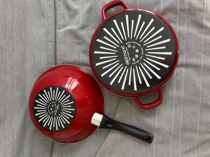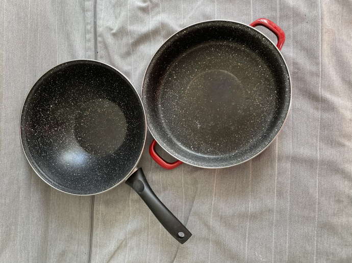Сковородки Delimano. В хорошем состоянии пользовались мало — не прижились. Для меня большие. Обе отдам за 150 крон