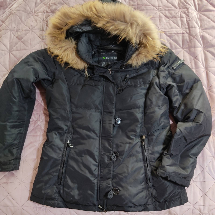 женская зимняя куртка HETREGO. Очень качественная, легкая, теплая. Внутри натур. пух, на капюшоне — натуральный мех. Капюшон отстегивается, мех тоже. Размер S-M. В отличном состоянии. 1000 крон.