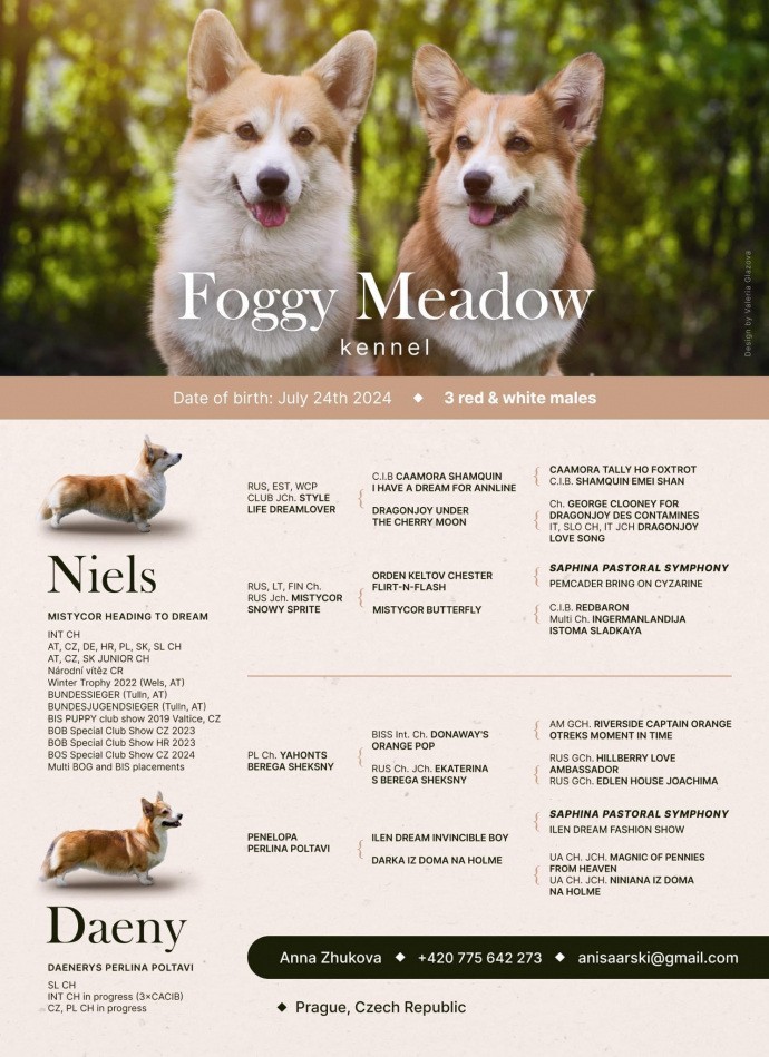 В породном питомнике Foggy Meadow есть свободные щенки вельш корги пемброк (мальчики). Щенки от здоровых и успешных на выставках родителей.Рождены 24.07.На данный момент 3 раза обработаны от паразитов, 2 раза провакцинированы. Будут иметь документы ČMKU (FCI).Растут в заботе и любви, в кругу семьи с котом ?.