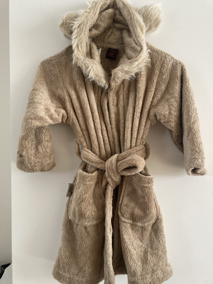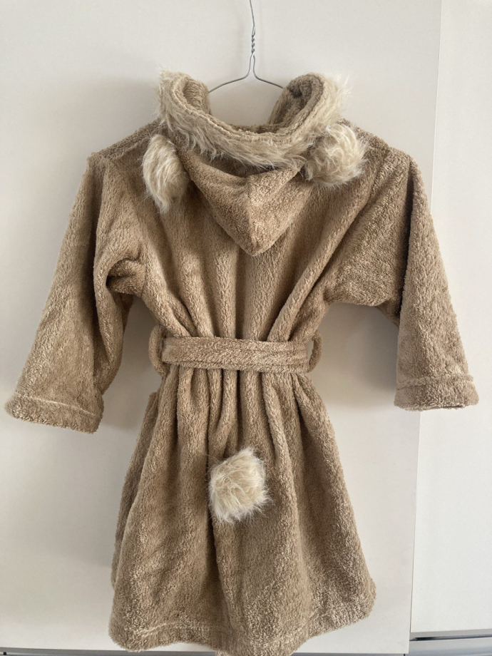 Уютный и красивый детский халат с капюшоном, милыми ушками и хвостиком. Абсолютно новый. В комплекте — мягкий плюшевый мишка, идеально дополняющий образ.