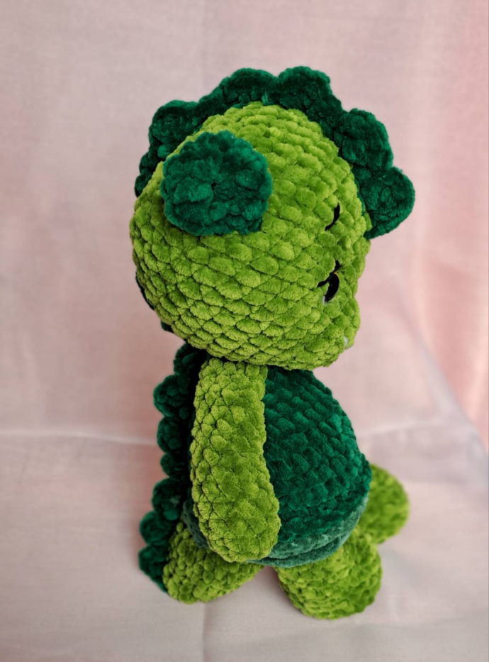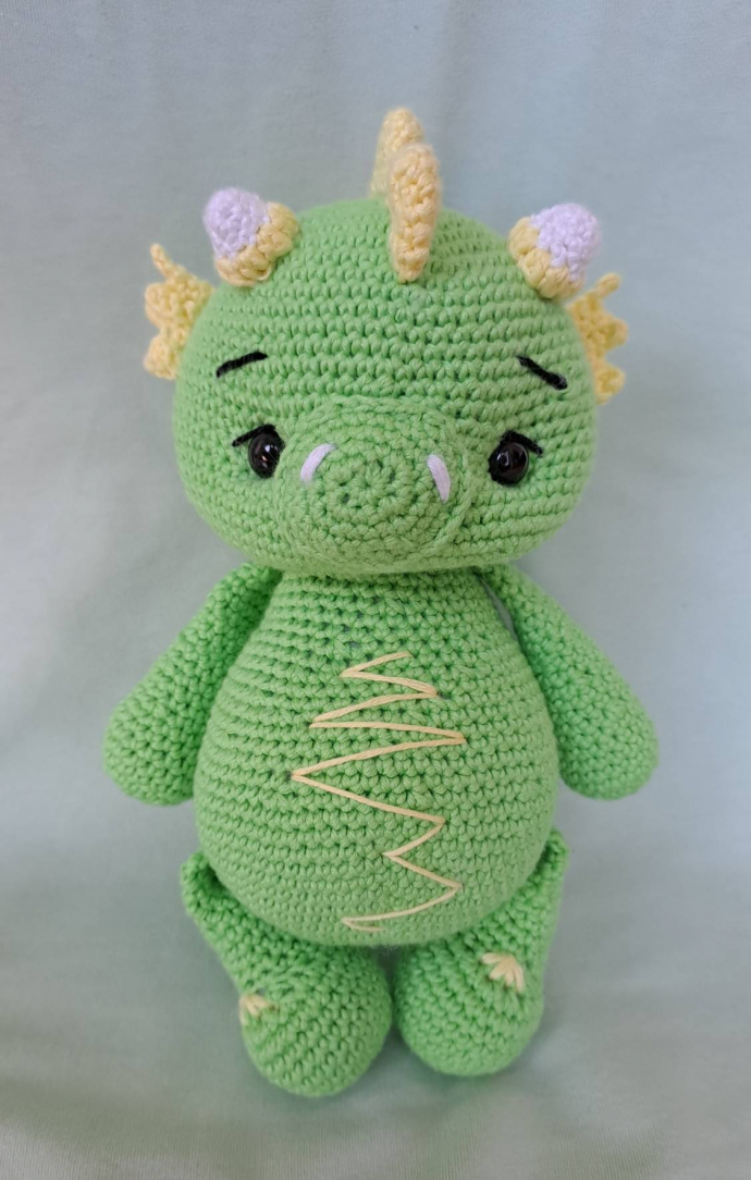 Динозавр девочка зеленый, глаза на безопасном креплении. Из пряжи Dolphin Baby Высота 28 см. Цена 380 Kč
