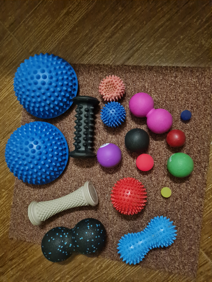 Купила постепенно пару мячиков для стоп, резинки для упражнений и балансирующую подушку надувную для упражнений.