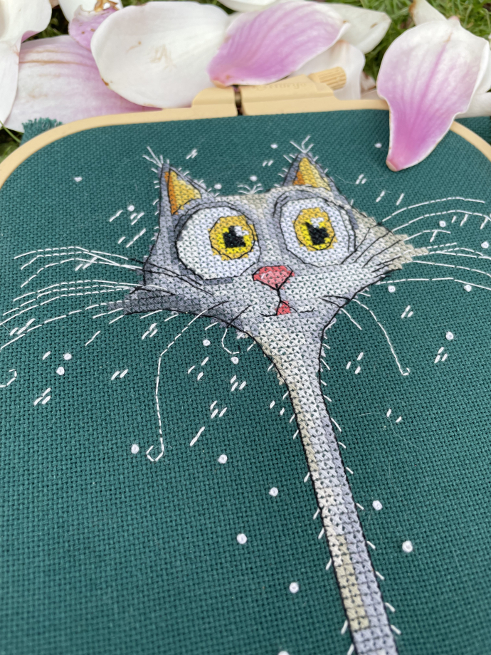 А вообще, работа мега классная! Очень позитивная и легкая! Схема супер, сюжет- ну все кошатники поймут. Основа- равномерка, рождественский зеленый. Нитки — схс.