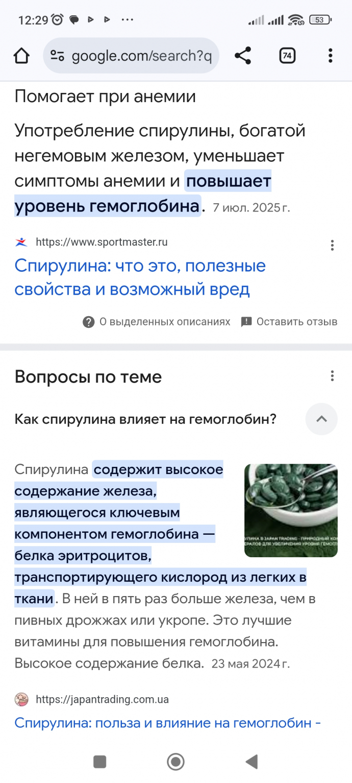 Ну и верно вам пишут, что спирулина поднять уровень железа не поможет, я пила таблетки.