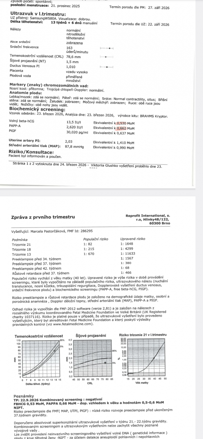 Сегодня позвонили за результаты скриннинга. Вероятности на генетические отклонения низкие, несмотря на возраст 40 лет в зеленой зоне. Но при этом оба параметра крови, Папп и свободныц хгч вышли по нижней границе нормы. Должны быть в районе 1, но вышло 0.53 и 0.63. Вроде все, что ниже 0.5 уже не норма.
