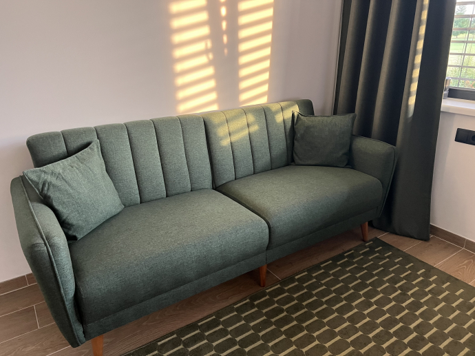Отличный, новый диван. Размер 200 см в длину, раскладывается как книжка, цена 4900 крон