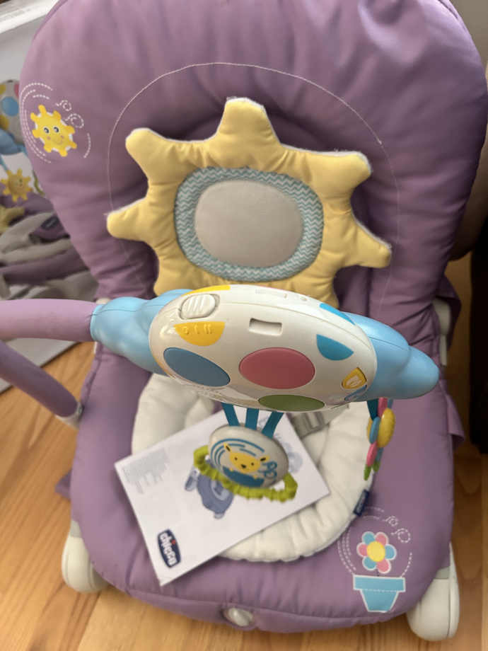 Кресло, очень хорошее состояние, все маленькие недостатки Вы можете видеть на фото. Регулируется вообще всё — угол наклона, ребенок может качаться сам или автоматически, стоппер, чтобы не качалось вовсе (было просто как обычное кресло) тоже есть. Музыка разная, плюс можно записать что-то свое, например, мамин голос. Есть подушечка для совсем маленьких под попу. Штука классная, рекомендую. 1900 крон.