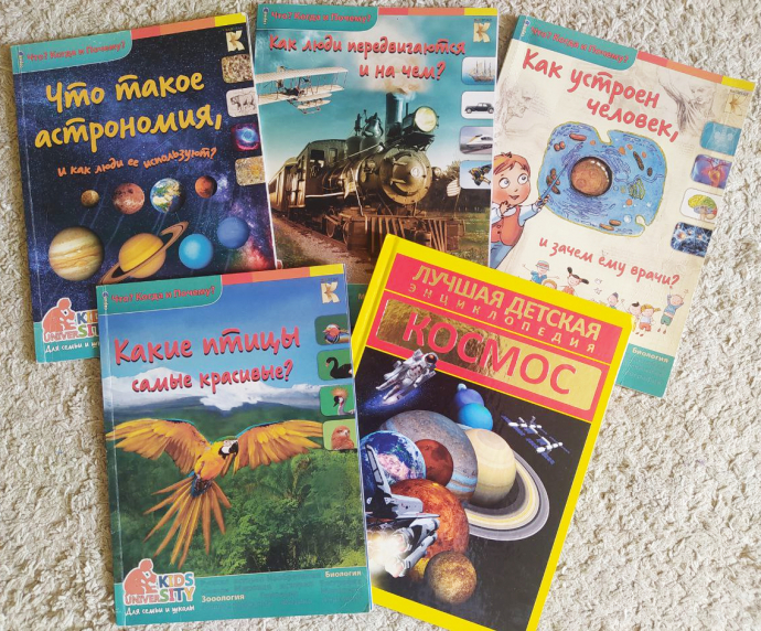 Книги для детей дошкольного (о птицах), младшего и среднего школьного возраста. Можно и с малышами их листать, будет о чем поговорить и порассуждать, порассматривать картинки и почерпнуть несколько новых слов. Книга о космосе состояние идеальное. Остальные — хорошее, не порваны и не испачканы.